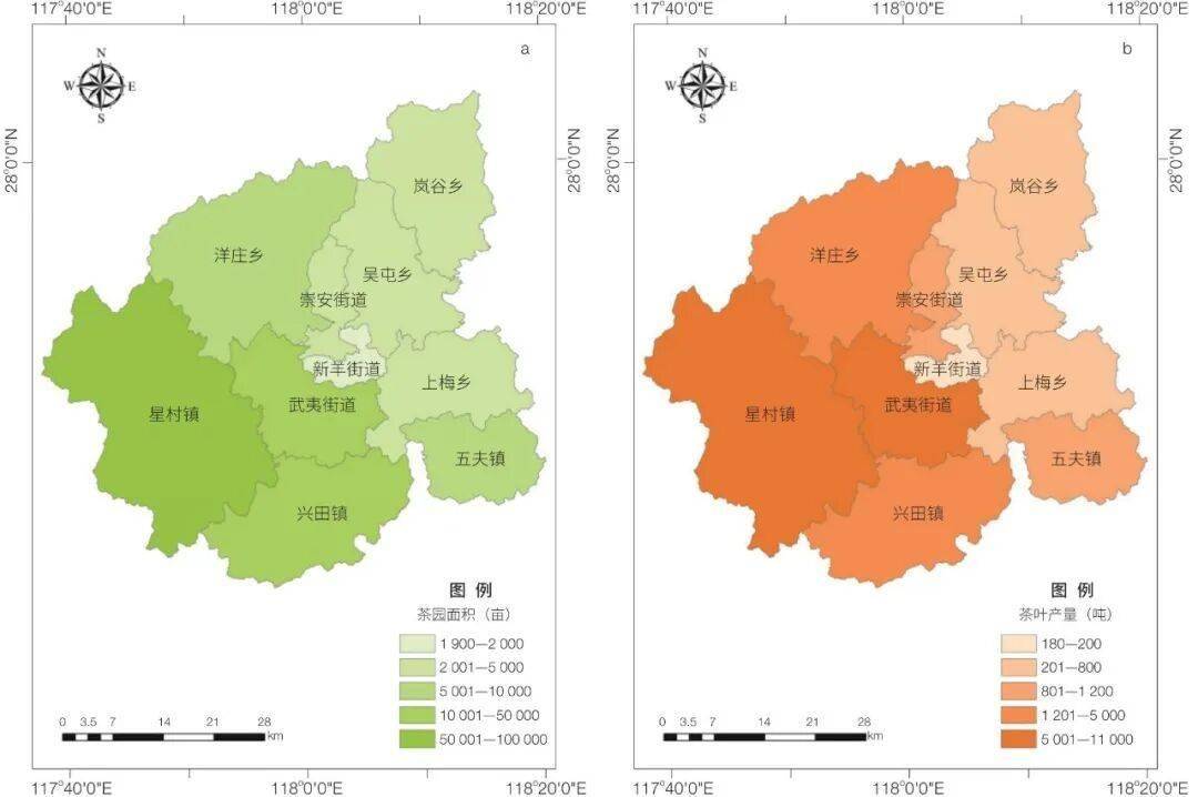 。正在此空间款式根本上,茶财产聚焦生态化种植、尺度化加工和品牌化营销三大焦点,建立起现代化生态财产系统。图2 2023年武夷山市各乡镇(街道)茶园面积(a)及茶产量(b)分布。